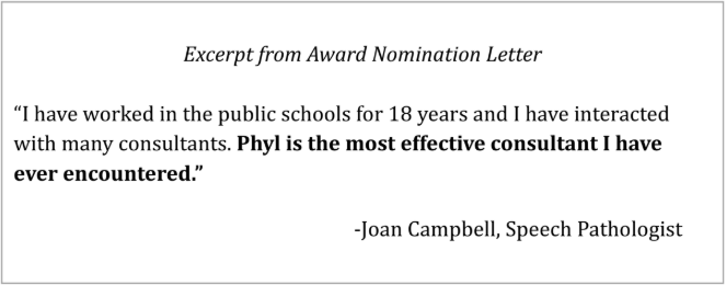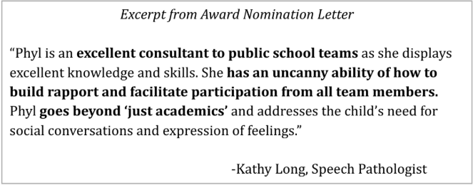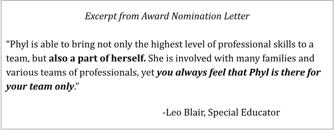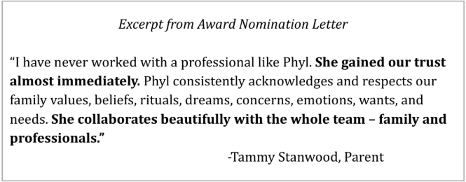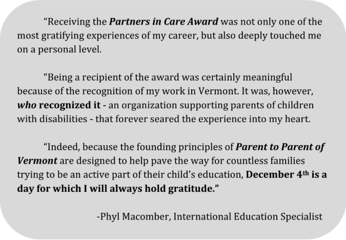 While there are many reasons why this acknowledgment of my work was very significant to me, perhaps the best way to convey its impact on me is to quote from a letter I sent to the folks at Parent to Parent of Vermont after the awards ceremony was held: