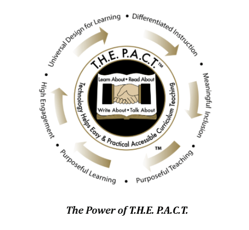 T.H.E. P.A.C.T., which stands for Technology Helps Easy & Practical Accessible Curriculum Teaching, consists of four easy-to-design-and-use modules titled Learn About, Read About, Write About, and Talk About – each aligned to educational standards.