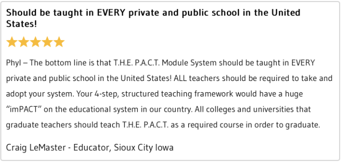 The Power of T.H.E. P.A.C.T., is a research-based roadmap for teaching anything to any learner of any ability or any age. This pre-K through graduation instructional framework outlines how to simplify teaching, which in turn simplifies learning.