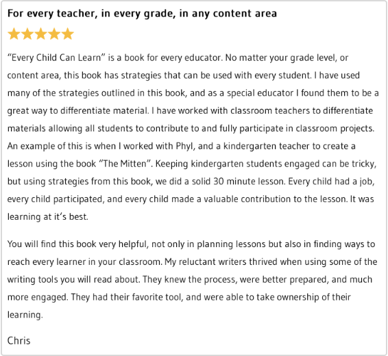 The strategies in Every Child Can Learn solve the pressing problem of how to balance developing creative lessons to reach all learners and using planning time wisely: working smarter, not harder.