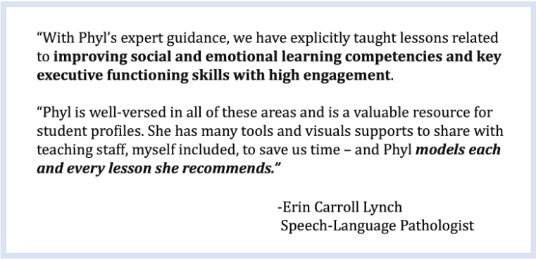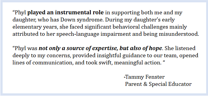 For students with disabilities, complex skills can be overwhelming for I.E.P. teams to break down into small, manageable steps. With Phyl’s skillful facilitation, there is enhanced teamwork and true collaboration amongst all educational team members – classroom teachers, special education staff, therapists, interventionists, administrators, and families – when developing meaningful goals and objectives in the student’s individualized education plan.