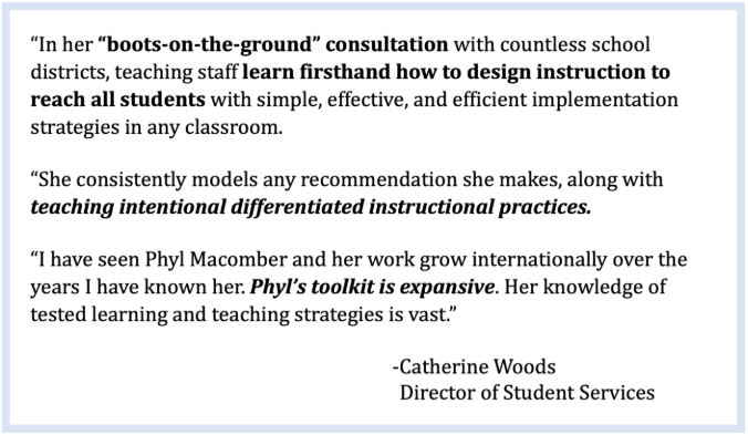 In addition, Phyl leads teams in how to mold accommodations for a student’s I.E.P. to a specific task. These accommodations are specific to the learning activity or assessment, ensuring they directly support the student’s ability to participate and demonstrate their knowledge.