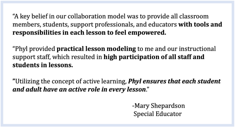 As part of her consensus collaboration consultation model, Phyl not only works with educators, but also the instructional support staff. Phyl believes that modeling for paraprofessionals is crucial when providing instructional support to students in accessing the curriculum and participating fully in class. When the instructional support staff are trained, they can better reinforce lessons, clarify concepts, and provide individualized assistance, leading to increased student engagement and academic success.