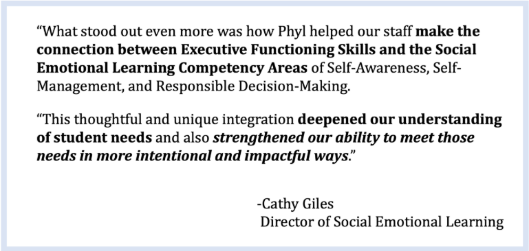 Phyl’s unique approach of embedding the explicit instruction of key executive functions while teaching social emotional learning skills has been adopted nationwide.