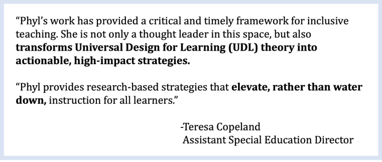 Using her time-efficient and practical “Use-the-Next-Day” teaching structure, Phyl masterfully models how to promote equitable educational opportunities which ensure that all students have access to the curriculum and can demonstrate their learning in various ways, which reduces barriers for students with disabilities or diverse learning needs.
