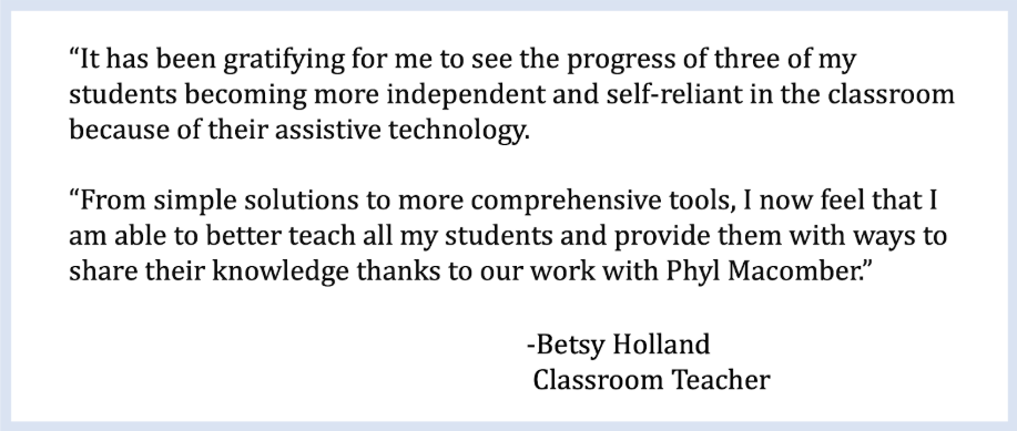 As a nationally certified Assistive Technology Practitioner (ATP) of RESNA – the Rehabilitation Engineering and Assistive Technology Society of North America, Phyl Macomber is dedicated to promoting the independence and well-being of children with disabilities through increasing access to technology solutions.